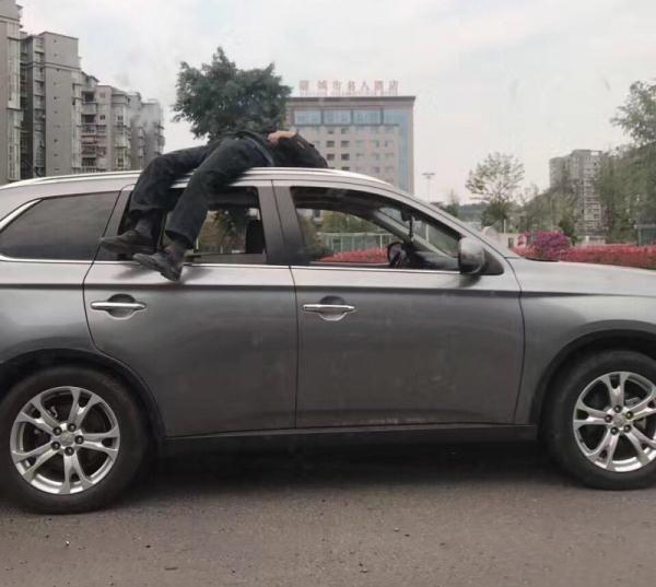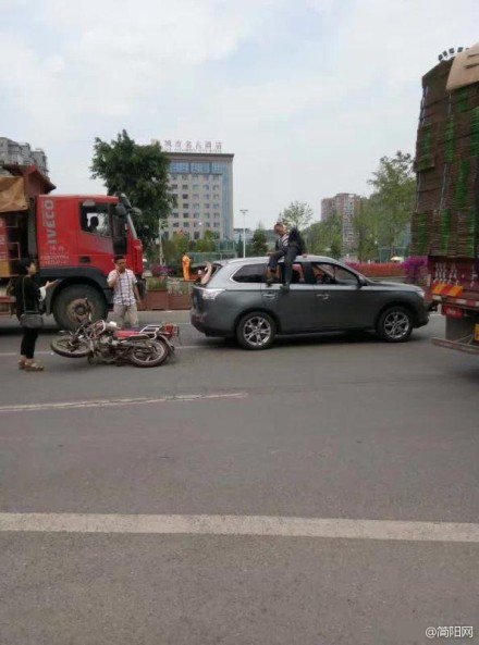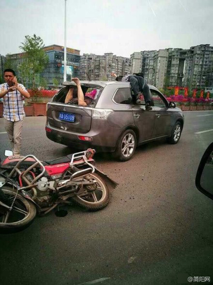 5月18日下午2點19分,四川省簡陽市旭海廣場門口發(fā)生一起車禍,一輛摩托車追尾一輛小車,摩托車上的兩名乘客一人“鉆”進了小車后備箱,一人“飛”上了小車車頂。