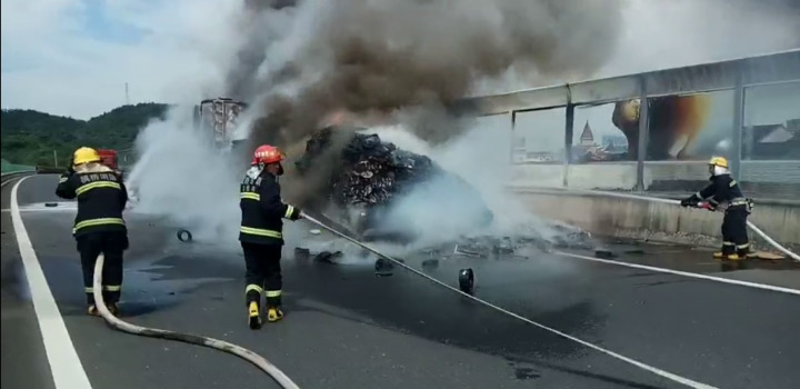 6月18日上午9點,在紹諸高速往諸暨方向的一個地方,一輛安徽牌照的半掛車起火,火勢非常兇猛。接警后,119指揮中心調(diào)派了諸暨市和越城區(qū)共7輛消防車,花了近50分鐘才將大火完全撲滅。司機鄭某介紹,這輛半掛車滿載著各種貨物,包括電子配件、油煙機、五金工具等,一行三人準備將貨物從寧波運往云南。在途經(jīng)事故路段時,鄭某突然發(fā)現(xiàn)車子的右后輪起火,于是連忙停車救火。但是苦于車上沒有滅火器材,只得用棉被澆上水蓋在著火的輪胎上,但是杯水車薪,火勢越少越猛。
