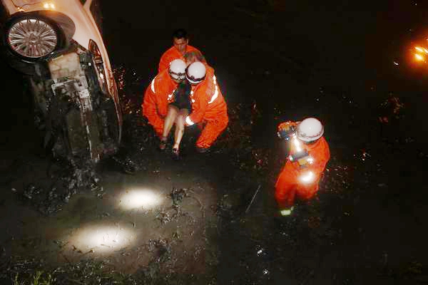 7月30日凌晨1時(shí)42分,云南省昭通魯?shù)榇箨?duì)值班室接到報(bào)警電話稱,昭魯快捷通道魯?shù)榭h柳樹閘帆船花園往魯?shù)榭h城新區(qū)方向30米處發(fā)生一起交通事故,一輛轎車墜入4米左右深的河道中,有4人被困,1人被現(xiàn)場(chǎng)群眾救出,還有3人被困車內(nèi),請(qǐng)消防隊(duì)救援。接到報(bào)警后,大隊(duì)立即出動(dòng)2車11人冒雨趕赴現(xiàn)場(chǎng)處置。