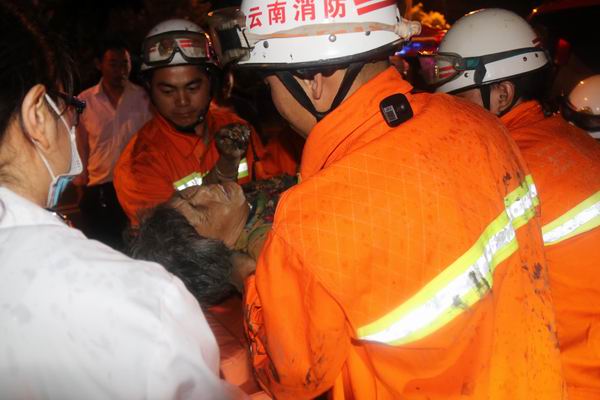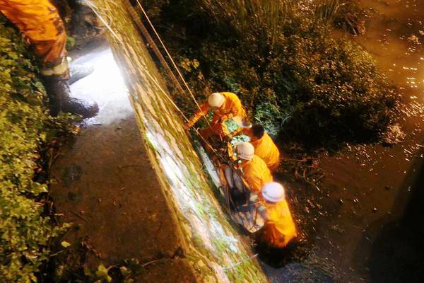 1時(shí)48分,救援官兵趕到現(xiàn)場(chǎng),經(jīng)偵詢得知,事故車輛墜入到了路邊4米左右深的河道中,河水深約1米,有4人被困車內(nèi),其中1人已被現(xiàn)場(chǎng)群眾救出,還有3人被困車內(nèi)。根據(jù)現(xiàn)場(chǎng)情況,指揮員立即派出4名官兵佩戴救援繩,攜帶撬棍和多功能救援擔(dān)架下到河床,對(duì)事故現(xiàn)場(chǎng)和被困人員情況進(jìn)行現(xiàn)場(chǎng)偵察,其余戰(zhàn)士全力協(xié)助緩緩下到河底,只見在河底一輛白色轎車沖進(jìn)了河道里,車身因受猛烈撞擊嚴(yán)重變形,車門因車身變形無法打開。了解情況后,偵察組戰(zhàn)士與路面的指揮員進(jìn)行了匯報(bào),指揮員決定再讓一名戰(zhàn)士帶上繩子下到河床,一起對(duì)被困人員進(jìn)行救援。不一會(huì)兒,另一名戰(zhàn)士按要求帶著繩子下到了河底。按照作戰(zhàn)方案,救援官兵立即用撬棍對(duì)車門進(jìn)行強(qiáng)行破拆,爭(zhēng)分奪秒投入到搶救被困人員的各項(xiàng)工作中。營(yíng)救被困人員的過程中,救援官兵的手指被劃破,河床泥沙、渾濁的河水、天空下著的雨水和汗水無數(shù)次浸透了救援官兵的衣褲,像抹了膠水一般緊貼在官兵的身上,萬分難受,但這并沒有擋住他們營(yíng)救被困者的步伐,他們這時(shí)只有一個(gè)念頭,那就是竭盡全力營(yíng)救被困人員。經(jīng)過近30多分鐘的緊張救援,破損的車門終于被打開,被困在車內(nèi)的3人成功救出。此時(shí)救援官兵的衣褲和帽子不知被汗水和雨水浸透了多少遍,但他們并沒有注意到自己衣帽上的濕了又干,干了又濕的層層汗跡,而是積極為如何將被困人員順利抬上河岸出主意,想辦法。河道河墻與河床成垂直狀,只有借助搶險(xiǎn)救援繩才能把被困人員順利抬上河岸。于是河岸上的救援官兵立即拿來了繩索,下放到了河底,河底救援的官兵將擔(dān)架的兩端系到繩上后,河岸邊的官兵同現(xiàn)場(chǎng)交警一道一起用力拉拽繩索,小心翼翼地將被困人員拉上了河岸。